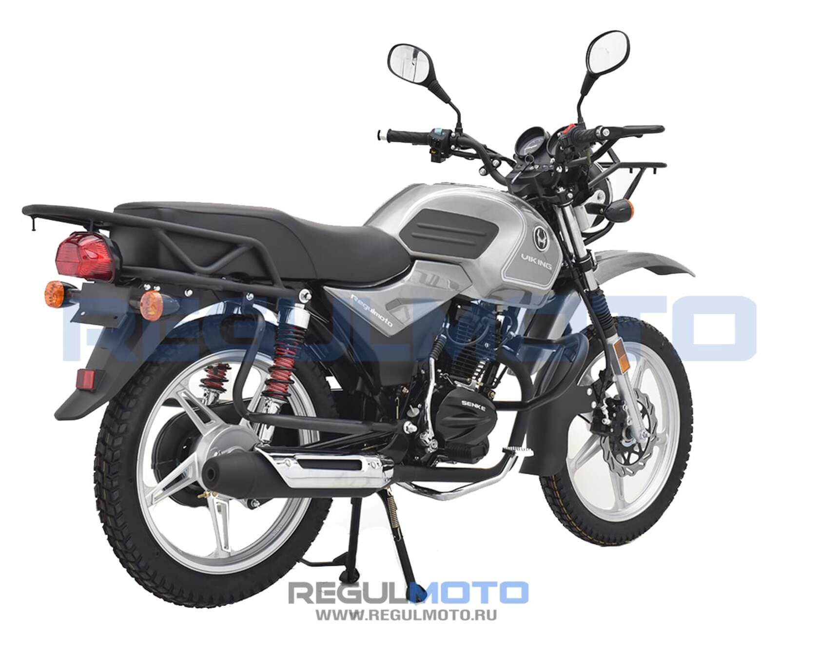 Компания «Regulmoto» представляет вниманию поклонников двухколесной мототехники мотоцикл Regulmoto VIKING – надежный и доступный для многих байк с широкими эксплуатационными возможностями. Мотоцикл Regulmoto VIKING – один из ярких представителей линейки малокубатурной мототехники известного азиатского производителя Senke. Мотоциклы производства одного из крупнейших китайских концернов пользуются заслуженным признанием экспертов и мотолюбителей в различных частях света, включая Европу и Америку. Продукцию Senke отличают не только одно из лучших на рынке соотношений достойного качества и демократичной цены, но и солидный эксплуатационный ресурс, высокая надежность, простое и недорогое сервисное обслуживание.В раме мотоцикла с 18-дюймовыми колесами на литых дисках установлен 4-тактный 150-«кубовый» двигатель с воздушным охлаждением, который способен развивать максимальную мощность в 11,6 лошадиных сил. Наличие у двигателя балансирного вала способствует снижению вибрации при работе мотора. 5-ступенчатая трансмиссия, электростартер, полноценная подвеска, представленная телескопической вилкой спереди и двумя амортизаторами и маятником сзади, приборная панель и емкий топливный бак – все это позволит получать максимум удовольствия от поездки. За безопасность использования мотоцикла отвечают надежная тормозная система (дисковый тормоз спереди и барабанный сзади), комплект светового оборудования и зеркал заднего вида.