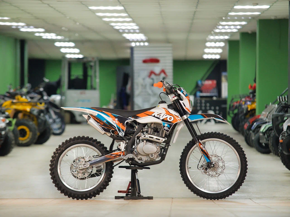 Кроссовый мотоцикл KAYO T4 300 Enduro PR 2024 модельного года – это надёжный, производительный и компактный кроссовый мотоцикл, который идеально подходит для любителей экстрима и езды по бездорожью. Модель обладает высокими характеристиками, производительным двигателем и прочной конструкцией, которая позволяет ей справляться с непростыми условиями маршрутов как на кроссовых трассах, так и в хард-эндуро.Одноцилиндровый 4-тактный двигатель воздушного охлаждения ZONGSHEN ZS175FMM-5 (PR300) с биг бором и балансирным валом имеет объём 271 см3 и выдаёт 24 л.с., что позволяет развивать большую скорость и с лёгкостью преодолевать трассы со сложным рельефом. Карбюратор NIBBI PE30 обеспечивает бесперебойную работу техники в самых жестких условиях эксплуатации, простоту и лёгкость в обслуживании, а также неприхотливость к качеству топлива. Двигатель оснащён 5-ступенчатой механической коробкой передач с классической схемой “1-N-2-3-4-5”.Усиленная рама фирменной разработки выполнена из хром-молибденового сплава, и в сочетании с регулируемой телескопической вилкой перевёрнутого типа длиной 880 мм и регулируемым моноамортизатором 450 мм с прогрессией, позволяют эффективно амортизировать удары при езде по неровностям и препятствиям на любых трассах. Оба компонента подвески произведены фирмой KKE. Мотоцикл оснащён классическими спицованными колёсами диаметром 18 дюймов сзади и 21 дюйм спереди. Высококачественная износостойкая резина с высокими грунтозацепами отлично держит дорогу на различных типах покрытия и в самых разных поворотах. Эффективное и безопасное замедление с любых скоростей обеспечивают гидравлические дисковые тормоза.Байк оснащён защитой для кистей, задним багажником и имеет систему запуска двигателя при помощи кнопки электростартера или при помощи рычага кик-стартера. Сиденье эргономичной формы покрыто антискользящим материалом. Данная модель укомплектована очень яркой линзованной светодиодной фарой, которая даёт возможность кататься в тёмное время суток.Благодаря наличию ПТС и всему необходимому комплекту светотехники, мотоцикл можно ставить на учёт в ГИБДД и ездить по дорогам общего пользования. KAYO T4 300 Enduro – это надёжный, производительный и мощный кроссовый мотоцикл с современным агрессивным дизайном для тех, кто не ищет лёгких путей.