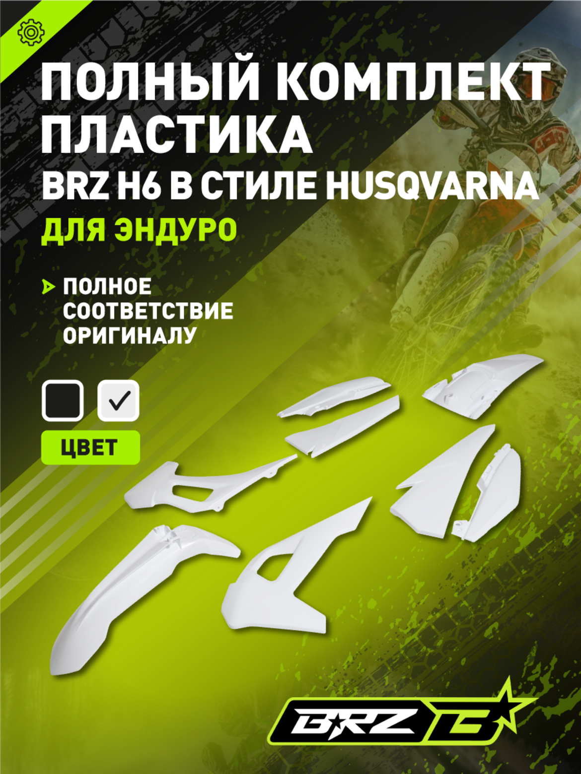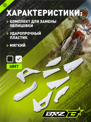 • Комплект пластика для BRZ H6, белый цвет. Дизайн выполнен в стиле Husqvarna, что придаёт мотоциклу современный и узнаваемый внешний вид. Комплект не имеет аналогов — является уникальной разработкой для данной модели, идеально подгоняется по геометрии и креплениям к раме BRZ H6. Пластик высокопрочный, устойчив к ударам, ультрафиолету и истиранию, рассчитан на эксплуатацию в самых разных условиях (эндуро, мотокросс, экстремальные поездки).