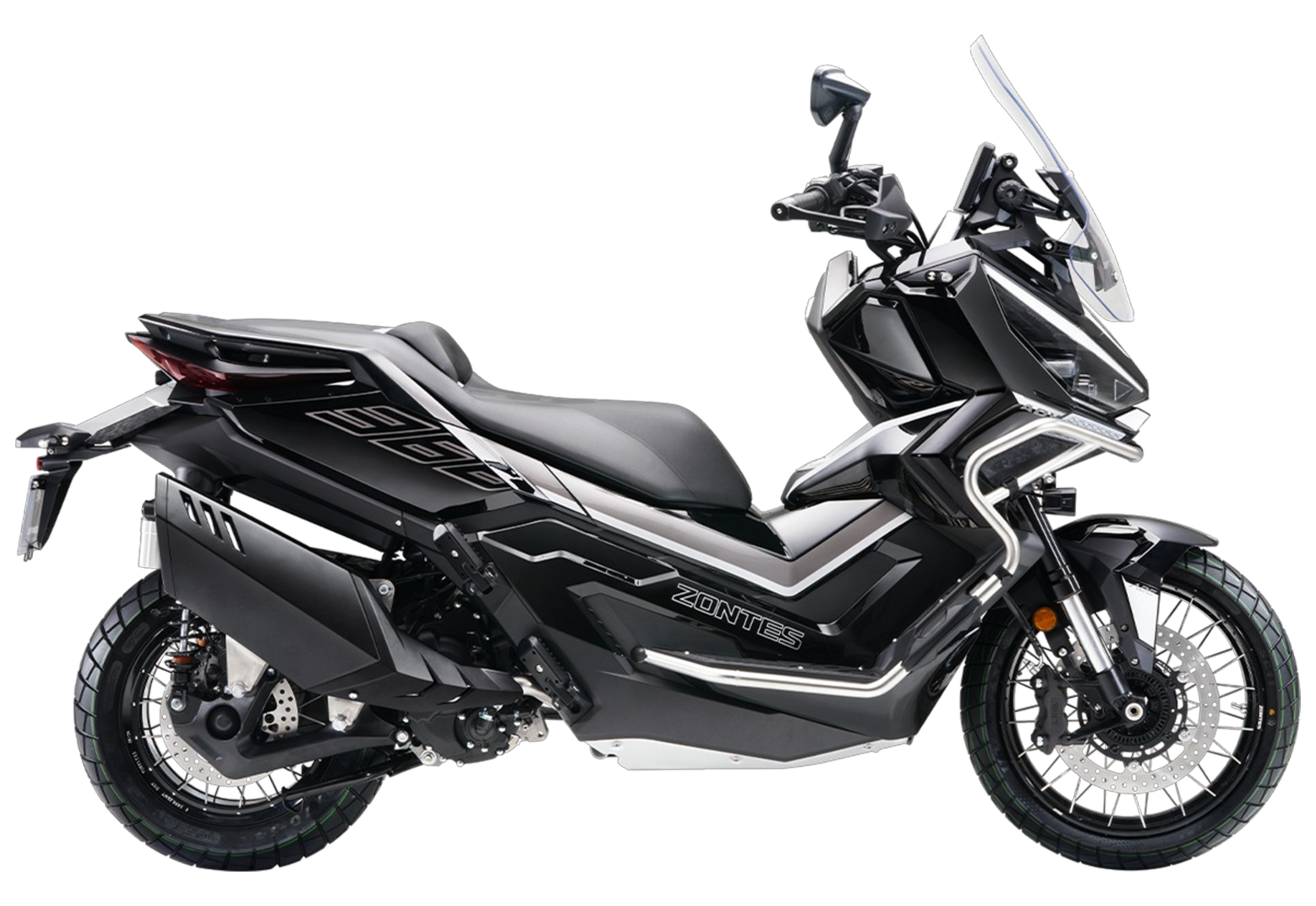 Скутер ZONTES ZT368-G – максискутер двойного назначения, готовый пронестись по улицам города за его пределы и отправиться по грунтовым тропам прокладывать свой маршрут туда, куда вам потребуется. Регулируемая подвеска с перевёрнутой телескопической вилкой спереди обеспечит отличную управляемость и устойчивость в любых условиях.Силовая установка представлена одноцилиндровым 4-тактным двигателем. Двигатель имеет объём 368 см³ и обеспечивает мощность в 38,8 л.с. Оснащён инжектором BOSCH, системой жидкостного охлаждения и вариатором. Запуск двигателя осуществляется с помощью бесключевого доступа.Ёмкость топливного бака 17,5 литра.Колёса имеют диаметр 17 дюймов спереди и 14 дюймов сзади. Для подвески спереди используется телескопическая вилка перевёрнутого типа, а сзади установлены 2 гидравлических амортизатора. Гидравлические дисковые тормоза произведены компанией J.JUAN, входящей в холдинг BREMBO. Мотоцикл также оснащён 2-канальной ABS-системой, противобуксовочной системой TCS System и датчиками давления в шинах.ZT350-G оборудован яркой LED-фарой, мультимедийной приборной панелью с TFT-дисплеем, имеются 2 USB-порта.Габариты скутера 2230х925х1290 мм. Колёсная база 1560 мм. Высота по седлу 795 мм. Вес 198 кг.