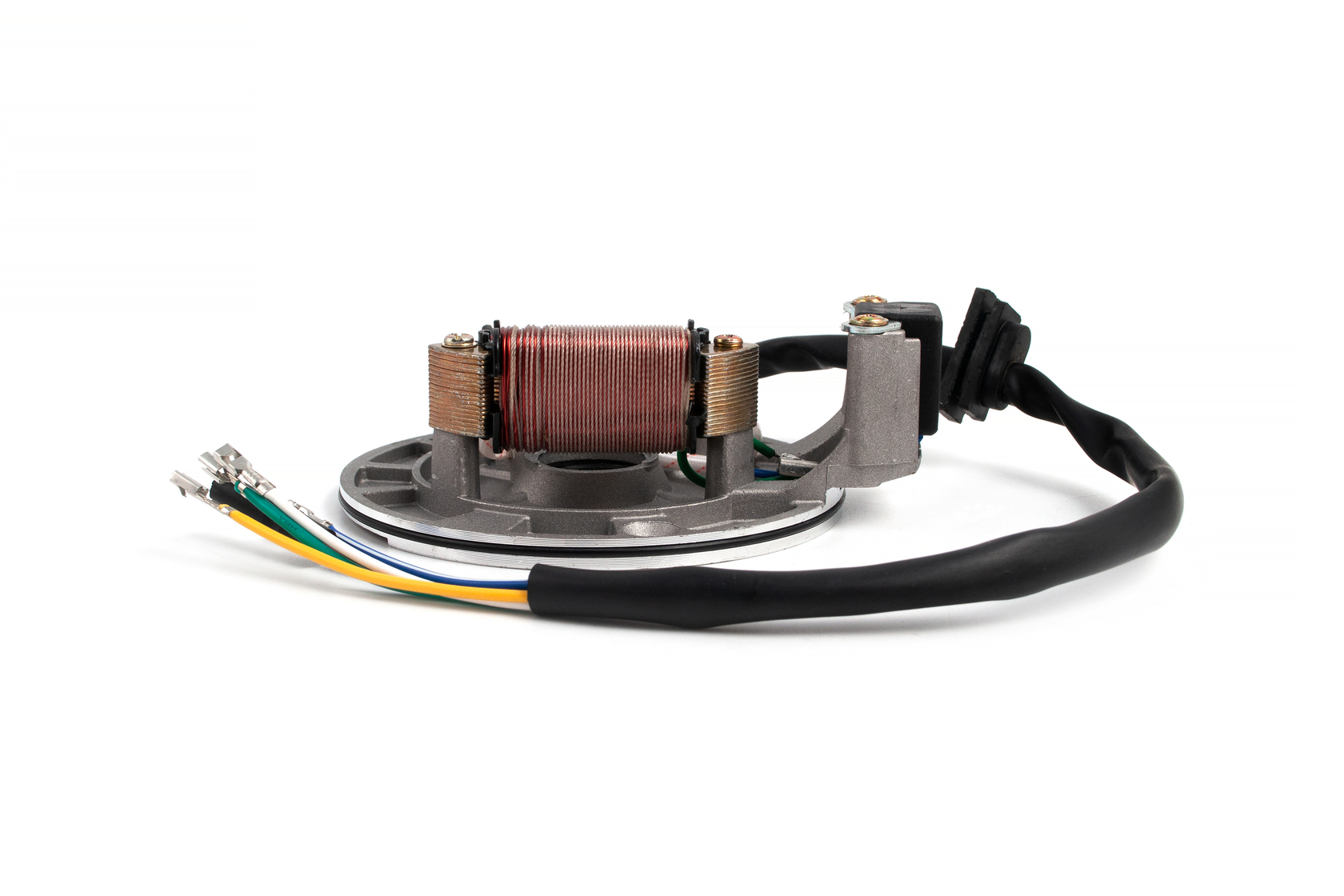 • Статор (неподвижная часть генератора) для 4-тактных двигателей 152-154 FMI объёмом 125 см³, не оснащённых электростартером. Содержит две независимые обмотки: одну — для генерации высокого напряжения для системы зажигания (CDI), вторую — для выработки переменного тока (~12В) для питания фары и габаритных огней. Ключевая особенность — предназначен только для двигателей с кикстартером.