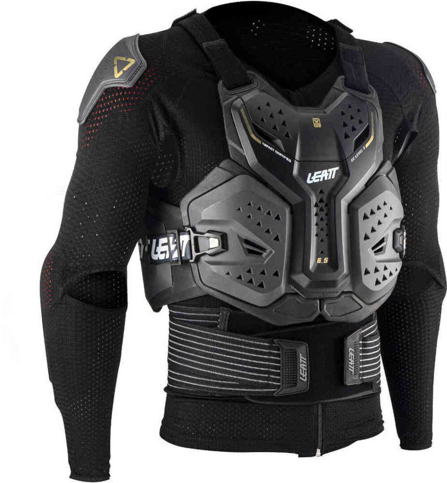 Панцирь с максимальной защитой тела, Body Protector 6.5 – новая модель в линейке защиты Leatt.Хорошо дышащая сетчатая основа на молнии обеспечивает плотную посадку и защиту локтей, плеч и оборудована регулируемым компрессионным поясом.Жёсткие многослойные составные пластины надёжно закрывают грудь, спину и ребра. Всё это не только обеспечивает непревзойдённый уровень безопасности, но и комфорт с хорошей вентиляцией во время езды.Благодаря такой конструкции панцирь легко надевается и снимается, легко очищаясь после длинного дня на мотоцикле.Особенности:• Жёсткий панцирь с пеной 3DF AirFit, эффективно гасящей удары;• 3D дизайн обеспечивает плотную посадку и максимальный комфорт;• Многослойная структура из нескольких пластин;• Каналы для эффективной вентиляции;• Сертификаты FIM и FFM;• Ткани, всюпитывающме влагу и запахи, противомикробные MoistureCool и AirMesh;• Основа из сетчатых материалов с противомикробными свойствами;• Съёмные передняя и задняя пластины;• Регулируемый компрессионный пояс;• Защита рёбер;• Система крепления защиты шеи • Сертифицирован и протестирован по стандарту CE: Грудь: CE prЕН1621-3 Level 2, Спина: CE EN1621-2 Level 2, Локти и плечи: CE EN1621-1;• Вес: 2,5 кг.