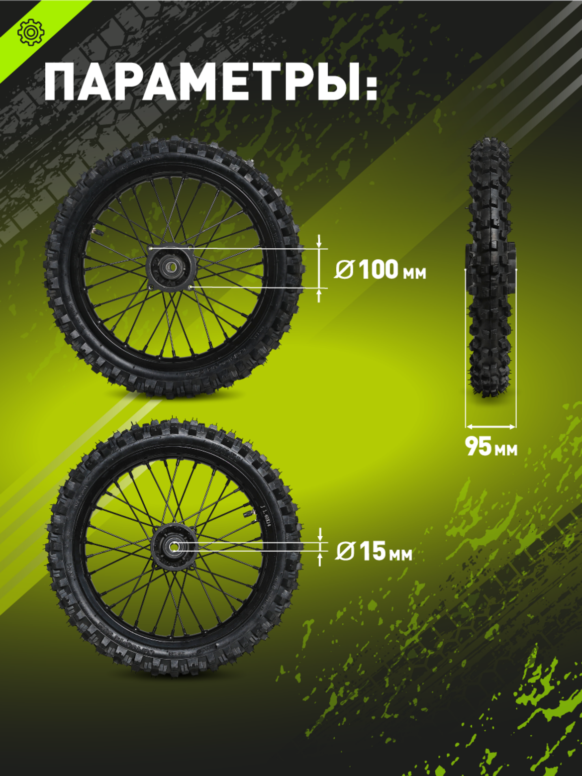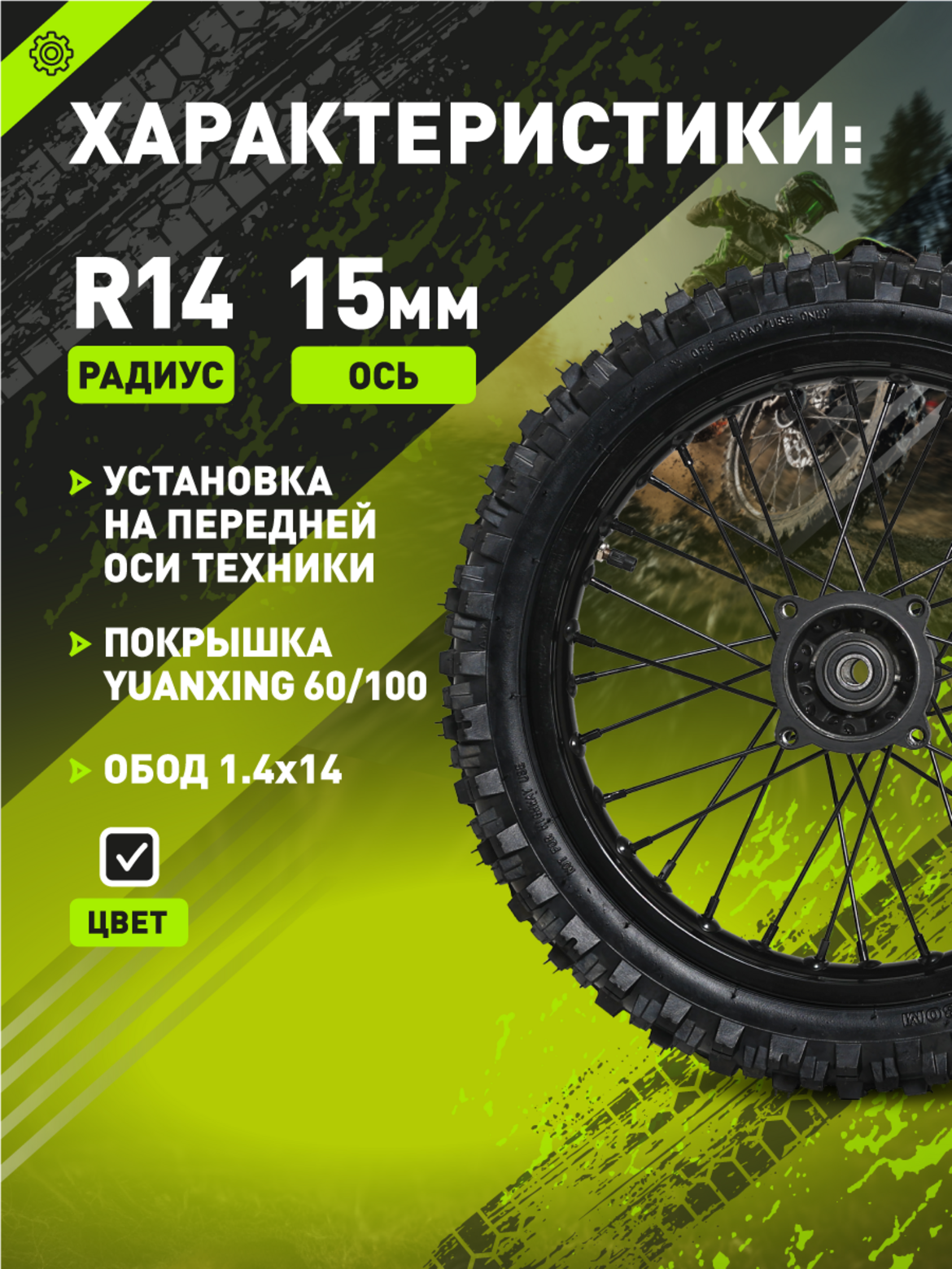 • Переднее колесо в полной комплектации с покрышкой. Алюминиевый обод черного цвета диаметром 14 дюймов. Посадочный диаметр под ось 15 мм. Поставляется без тормозного диска и без оси в комплекте.