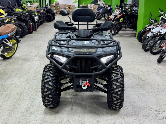 Комплектация Багажник: Сзади и спереди; Лебедка: Есть (управление кнопками на руле); Светодиодные фары головного света (ближний-дальний свет), задний габарит/стоп-сигнал, поворотники, «аварийка»