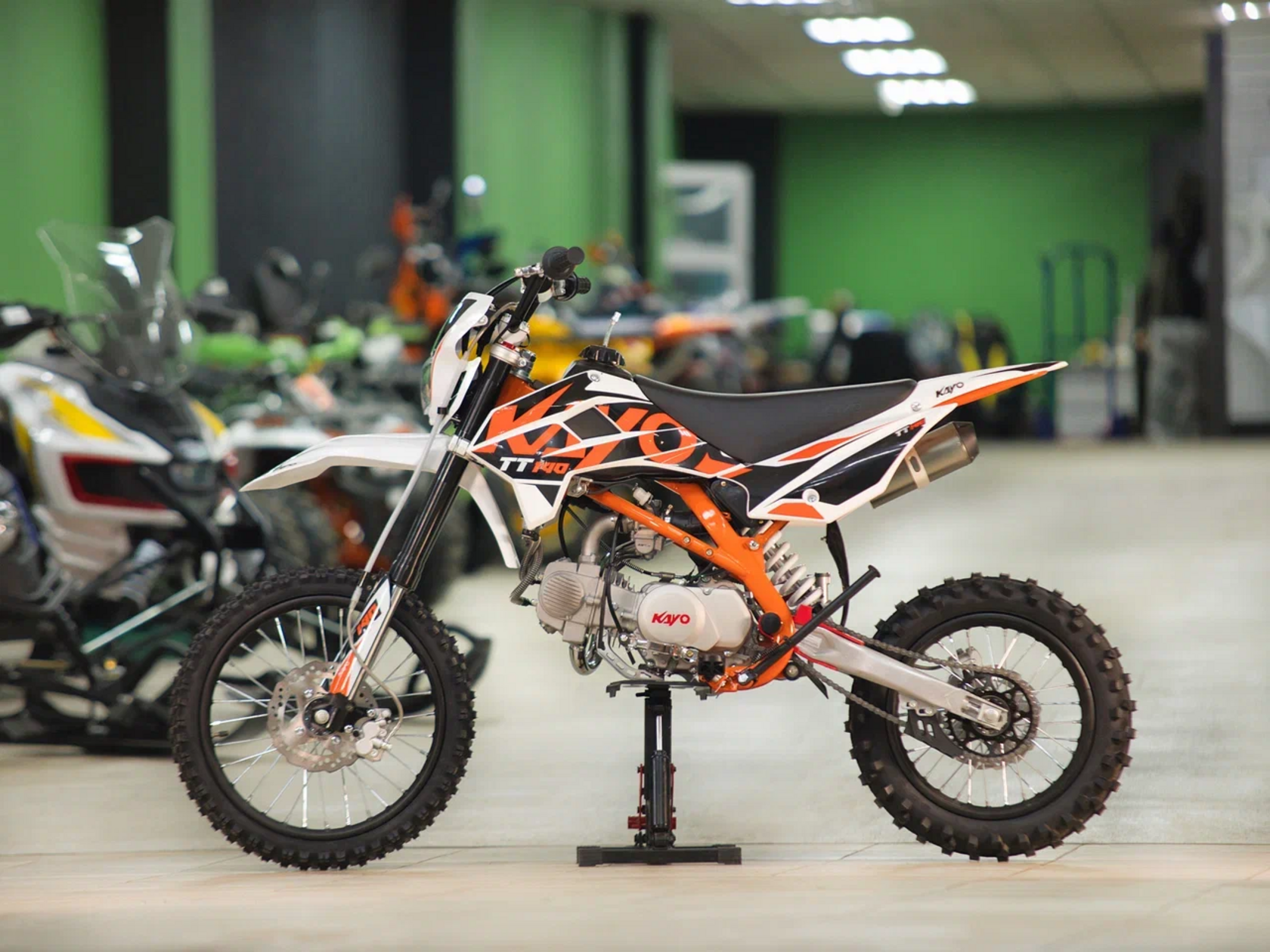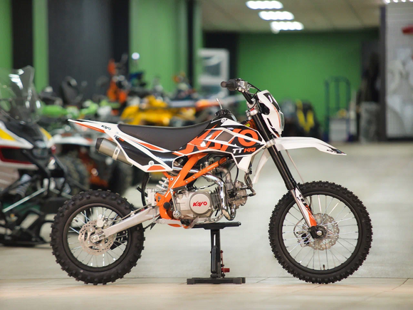 Питбайк KAYO Basic TT140 KRZ – версия для прогрессирующих и хороший старт для тех, кто готов перейти от базовых тренировок к более сложным заездам. Подходит для лёгкого эндуро и оттачивания мастерства.Одноцилиндровый 4-тактный двигатель воздушно-масляного охлаждения YX1P56FMJ объёмом 140 см3, выдаёт 13 л.с. Карбюратор NIBBI PE19 обеспечивает бесперебойную работу техники в самых жёстких условиях эксплуатации, простоту и лёгкость в обслуживании, а также неприхотливость к качеству топлива. Питбайк имеет вместительный топливный бак на 5,5 л. Питбайк оснащён механической 4-ступенчатой коробкой передач с формулой “N-1-2-3-4”. Запуск двигателя осуществляется с помощью рычага кикстартера.Мотоцикл имеет вес всего 73 кг. Усиленная рама из хром-молибденового сплава и подвеска позволяют эффективно амортизировать удары при езде по неровностям и препятствиям на трассе. Передняя подвеска — телескопическая вилка перевёрнутого типа длиной 770 мм, задняя — моноамортизатор длиной 360 мм. Оба компонента подвески являются нерегулируемыми. Рама и пластик являются собственной разработкой производителя. Мотоцикл оснащён классическими стальными спицованными колёсами диаметром 17 дюймов спереди и 14 дюймов сзади. Эффективное и безопасное замедление с любых скоростей обеспечивают гидравлические дисковые тормоза. Высококачественная износостойкая резина с развитым протектором отлично держит дорогу на различных типах покрытия.Питбайк оснащён яркой светодиодной линзованной фарой, позволяющей кататься в тёмное время суток.Если вы ищете послушный, компактный, динамичный и красивый питбайк, считайте, что вы его нашли. Это один из лучших мотоциклов для обучения и первых шагов в эндуро и мотокроссе. Он отлично подойдёт как для гонок на трассе, так и для обычного катания по пересечённой местности.