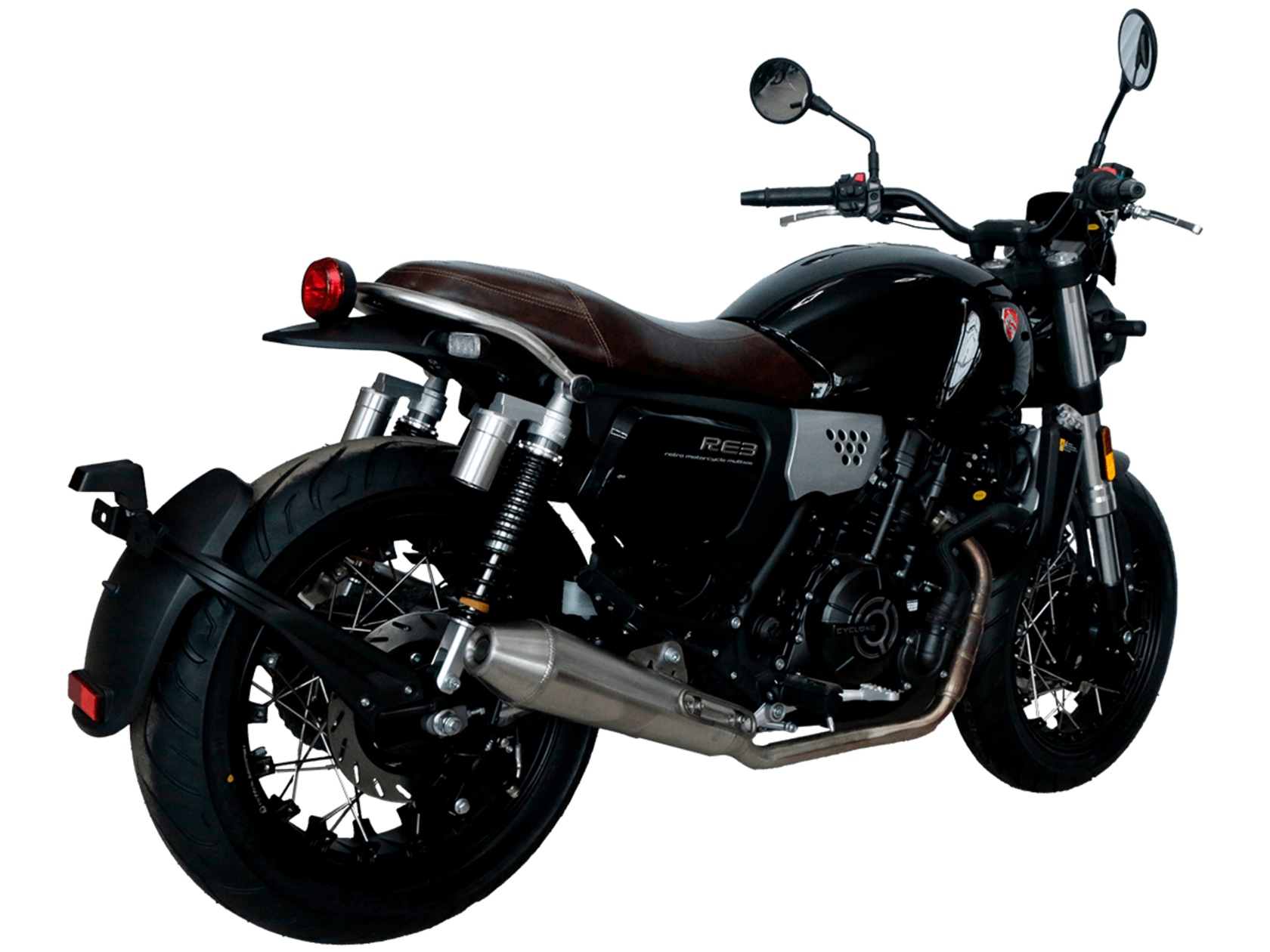 CYCLONE RE3 (SR400) – классик, в котором подчёркнутая простота объединяется с современными технологиями.Двухцилиндровый четырёхтактный двигатель объёмом 401 см3 выдаёт 43 л.с. на 9500 об/мин. Максимальный крутящий момент достигается на 8000 об/мин и составляет 34 Н·м. Инжекторный впрыск топлива с инжектором BOSCH увеличивает топливную экономичность, а также позволяет добиться высокой приёмистости и неприхотливости агрегата. Жидкостная система охлаждения не допустит перегрева двигателя даже при самом агрессивном вождении. На мотоцикл установлена 6-ступенчатая механическая коробка передач.Максимальная скорость мотоцикла составляет 140 км/ч.RE3 оснащён классическими спицованными колёсами диаметром 17 дюймов. Колёса обуты в бескамерные покрышки TIMSUN. С неровностями дороги эффективно справляются регулируемая телескопическая вилка перевёрнутого типа спереди и маятник с двумя амортизаторами сзади. Ход передней подвески составляет 110 мм, задней – 81 мм. Эффективное и безопасное замедление с любых скоростей обеспечивают гидравлические дисковые тормоза с ABS спереди и сзади.Клиренс мотоцикла составляет 145 мм. Объём топливного бака – 19 л. Снаряжённая масса – 186 кг.Из дополнительного оборудования можно выделить USB-порт, подсветку пультов и датчики давления в шинах.Мотоцикл сочетает в себе отличные технические характеристики, комфорт и надёжность, что позволяет вам ощутить настоящую свободу на любой дороге.