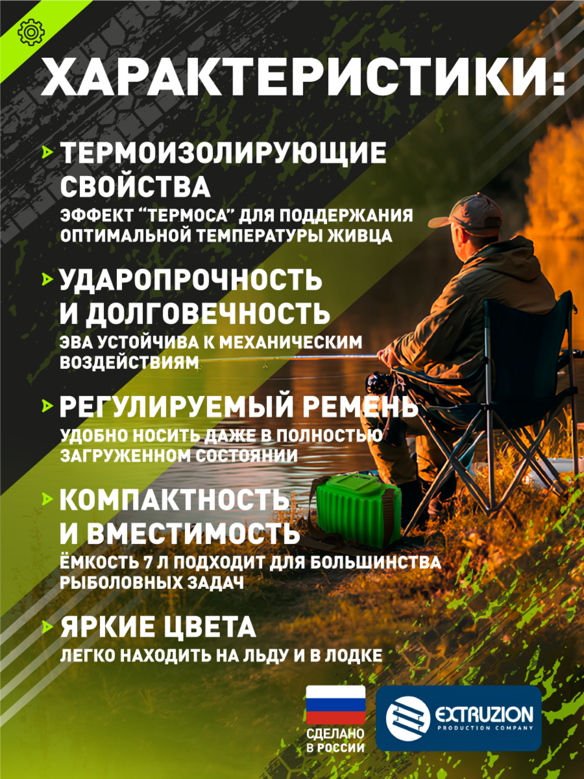 • Компактность и вместимость — ёмкость 7 л подходит для большинства рыболовных задач