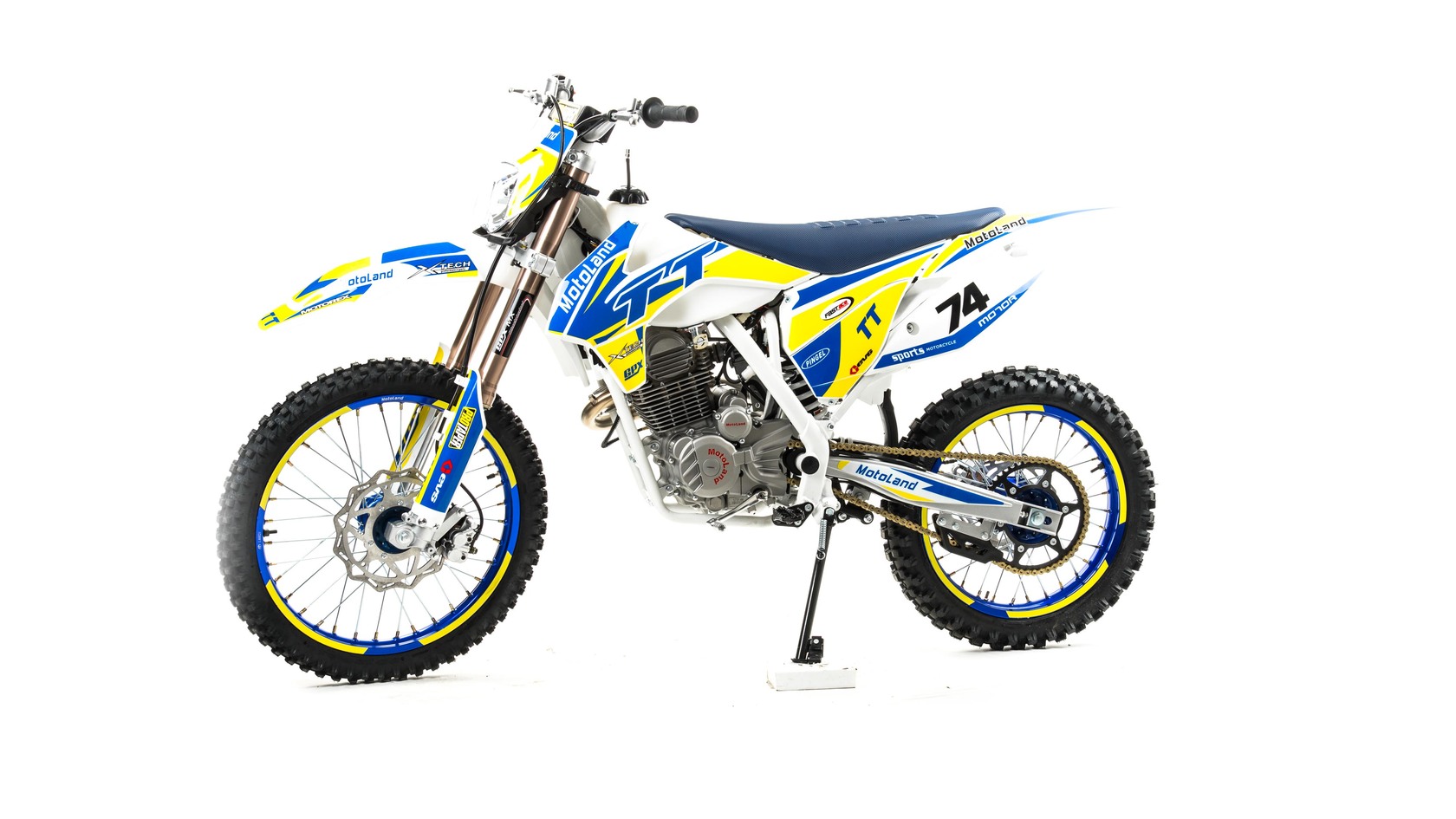 MotoLand TT 250.Надёжная техника из самых популярных компонентов оснащена Двигателем ZONGSHEN 172FMM с кикстартером и электростартером Мощностью 21 Л.С. на двигателе установлен Карбюратор NIBBI PE28.Это полноразмерный кроссовый мотоцикл, его база по осям составляет 1430 мм., и габаритами 2180х800х1300 мм. Высота по седлу составляет 950 мм., что по сравнению с моделью XT 250 ST 21/19 ниже порядка 20 мм. Что позволяет комфортно себя чувствовать райдерам среднего роста.За счет сбалансированной базы мотоцикл имеет отличную управляемость, а конструкция рамы и особенности настройки подвески GPX способствуют максимальному поглощению неровностей дорожного покрытия, а так же усиленная прогрессия на игольчатых подшипниках.Алюминиевые обода c антибуксаторами, усиленными спицами и ступицами CNC. На кроссовой резине Yuanxing 80/100-21 / 100/90-18На мотоцикле установлена обновлённая тормозная система аналог «brembo» с медными колодками , что обеспечивает отличные тормозные характеристики. Особенностью заднего тормоза является, лапка верхнего расположения с эксцентриковой регулировкой.Выпускной патрубок с резонатором Power Bomb имеет крепления на пружинах для снижения вибрации. Глушитель с уникальным дизайном прямоточного типа, полностью алюминиевый для облегчения веса.