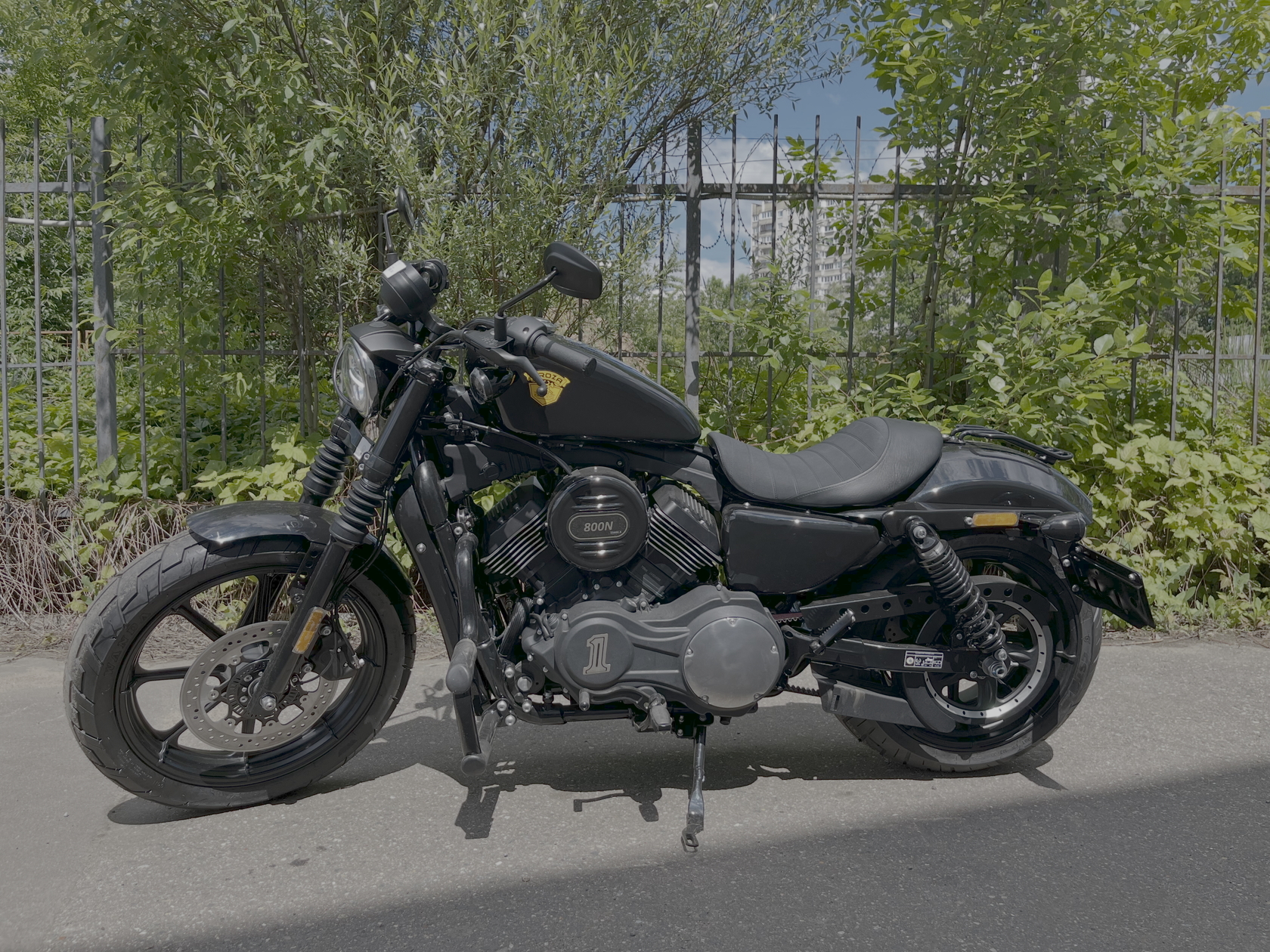 GROZA Toughman 800 – суровый и брутальный круизёр, который сразу обращает на себя внимание в потоке своей схожестью с кастом-байком: спартанской простотой с монохромной гаммой, олдскульными элементами, изящно оформленным двигателем, великолепной выхлопной системой и широченной задней покрышкой.Двухцилиндровый V-образный двигатель объёмом 800 см3 мощностью 61 л.с. при высоких показателях динамики и отличном крутящем моменте способен разгонять аппарат до 160 км/ч. Инжекторный впрыск топлива с инжектором DELPHI увеличивает топливную экономичность, а также позволяет добиться высокой приёмистости и неприхотливости агрегата. Привод на ведущее колесо осуществляется ремнём знаменитой марки USA Gates. Жидкостная система охлаждения не допустит перегрева мотора даже при самом агрессивном вождении.Аппарат имеет 6-ступенчатую механическую коробку передач с классической схемой “1-N-2-3-4-5-6”. На мотоцикл установлены литые алюминиевые диски диаметром 19 дюймов спереди и 17 дюймов сзади. Ширина передней покрышки – 130 мм, задней – целых 240 мм! С неровностями дороги эффективно справляются телескопическая вилка спереди и маятник с двумя газонаполненными амортизаторами сзади. Эффективное и безопасное замедление с любых скоростей обеспечивают гидравлические дисковые тормоза спереди и сзади.Байк обладает внушительным дорожным просветом 160 мм, что позволяет, при желании, съезжать на дороги с худшим покрытием, нежели асфальт. Зеркала не выходят за габариты руля, что позволяет комфортно проезжать на нём в междурядье.Мотоцикл сочетает в себе отличные технические характеристики, комфорт и надёжность, что позволяет вам ощутить настоящую свободу на любой дороге.