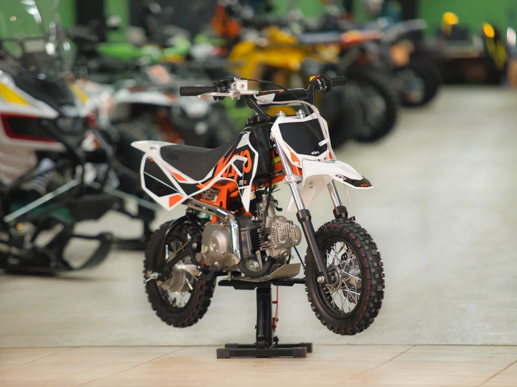 Питбайк KAYO Mini TS70 10/10 – идеальный снаряд для юных экстремалов, который можно использовать на лёгких кроссовых трассах и дорогах с различным покрытием. Удобный, простой и надёжный мотоцикл, который полностью оправдывает свою цену.Одноцилиндровый 4-тактный двигатель воздушного охлаждения YX1P47FMD объёмом 72 см3, выдаёт 5 л.с. Карбюратор JK PZ19 обеспечивает бесперебойную работу техники в самых жёстких условиях эксплуатации, простоту и лёгкость в обслуживании, а также неприхотливость к качеству топлива. Питбайк оснащён автоматической коробкой передач, что позволит райдерам полностью сосредоточиться на управлении питбайком.Аппарат имеет вес всего 52 кг. Усиленная рама из хром-молибденового сплава и подвеска позволяют эффективно амортизировать удары при езде по неровностям и препятствиям на трассе. Передняя подвеска – телескопическая вилка длиной 540 мм, задняя – моноамортизатор 255 мм. Рама и пластик являются собственной разработкой производителя. Мотоцикл оснащён классическими стальными спицованными колёсами диаметром 10 дюймов. Эффективное и безопасное замедление с любых скоростей обеспечивают гидравлический дисковый тормоз спереди и барабанный – сзади. Высококачественная износостойкая резина с развитым протектором отлично держит дорогу на различных типах покрытия. Байк оснащён системой запуска двигателя при помощи кнопки электростартера.Если вы ищете послушный, компактный, шустрый, красивый питбайк для своего малыша, считайте, что вы его нашли.