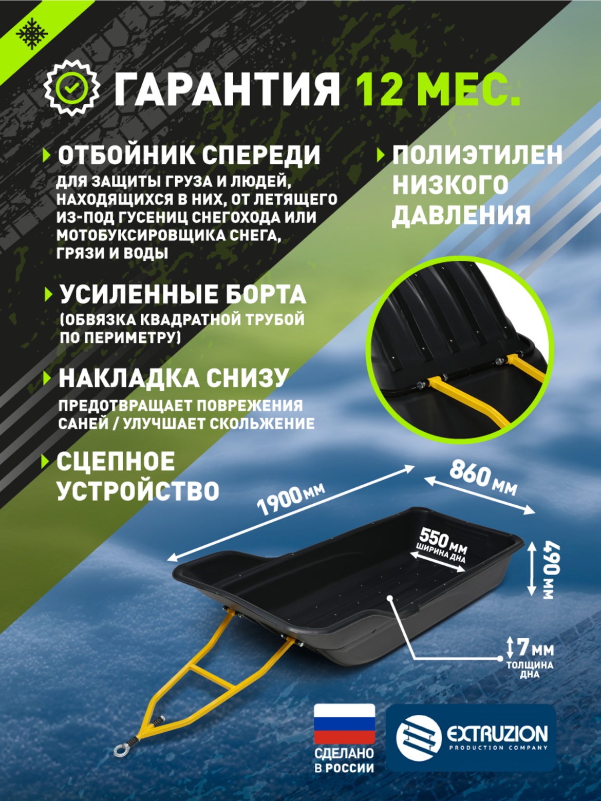 • Крупногабаритные сани-прицеп для профессионального использования с снегоходами и мотобуксировщиками. Увеличенные габариты 2100×860×490 мм обеспечивают повышенную вместимость для перевозки объемных грузов. Изготовлены из сверхпрочного ПНД с УФ-стабилизацией. Комплектуются сцепным устройством, стропами обвязки и накладными полозьями для улучшенного скольжения.
