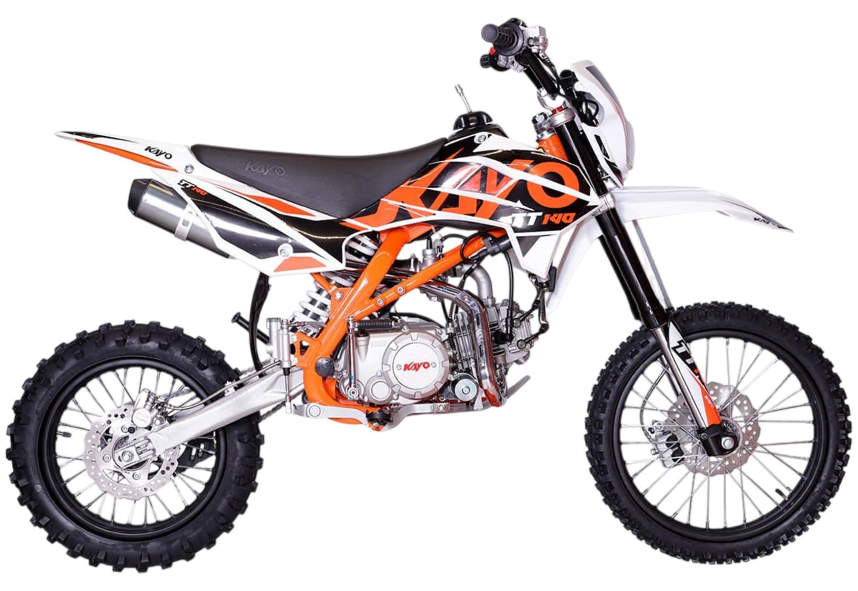 Питбайк KAYO Basic TT140EM KRZ – простой в обслуживании и выносливый байк для тренировок. Рекомендован подросткам, которые готовятся к соревнованиям, но подойдёт и для повседневных прокатов. Одноцилиндровый 4-тактный двигатель воздушно-масляного охлаждения YX1P56FMJ объёмом 140 см3, выдаёт 11 л.с. Карбюратор NIBBI PE19 обеспечивает бесперебойную работу техники в самых жёстких условиях эксплуатации, простоту и лёгкость в обслуживании, а также неприхотливость к качеству топлива. Питбайк имеет вместительный топливный бак на 5,5 л. Питбайк оснащён механической 4-ступенчатой коробкой передач с формулой “N-1-2-3-4”. Запуск двигателя осуществляется с помощью рычага кикстартера.Мотоцикл имеет вес всего 72 кг. Усиленная рама из хром-молибденового сплава и подвеска позволяют эффективно амортизировать удары при езде по неровностям и препятствиям на трассе. Передняя подвеска — телескопическая вилка перевёрнутого типа длиной 770 мм, задняя — моноамортизатор длиной 360 мм. Оба компонента подвески являются нерегулируемыми. Рама и пластик являются собственной разработкой производителя. Мотоцикл оснащён классическими стальными спицованными колёсами диаметром 17 дюймов спереди и 14 дюймов сзади. Эффективное и безопасное замедление с любых скоростей обеспечивают гидравлические дисковые тормоза. Высококачественная износостойкая резина с развитым протектором отлично держит дорогу на различных типах покрытия.Питбайк оснащён яркой светодиодной линзованной фарой, позволяющей кататься в тёмное время суток.Если вы ищете послушный, компактный, динамичный и красивый питбайк, считайте, что вы его нашли. Это один из лучших мотоциклов для обучения и первых шагов в эндуро и мотокроссе. Он отлично подойдёт как для гонок на трассе, так и для обычного катания по пересечённой местности.