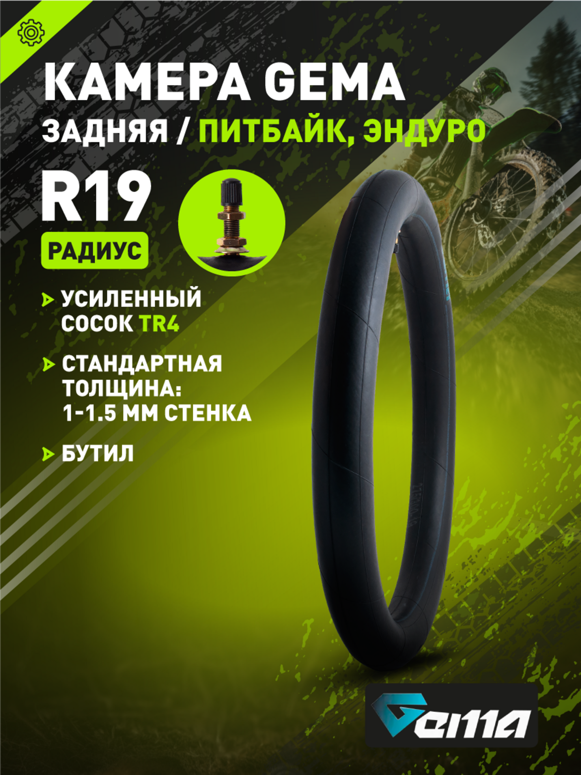 Универсальная задняя камера GEMA для кроссовых и эндуро мотоциклов с задним колесом 19 дюймов. Оптимальна для шин шириной 3.00–3.25", может использоваться с более узкими и широкими покрышками при условии аккуратной установки.Основные характеристики: