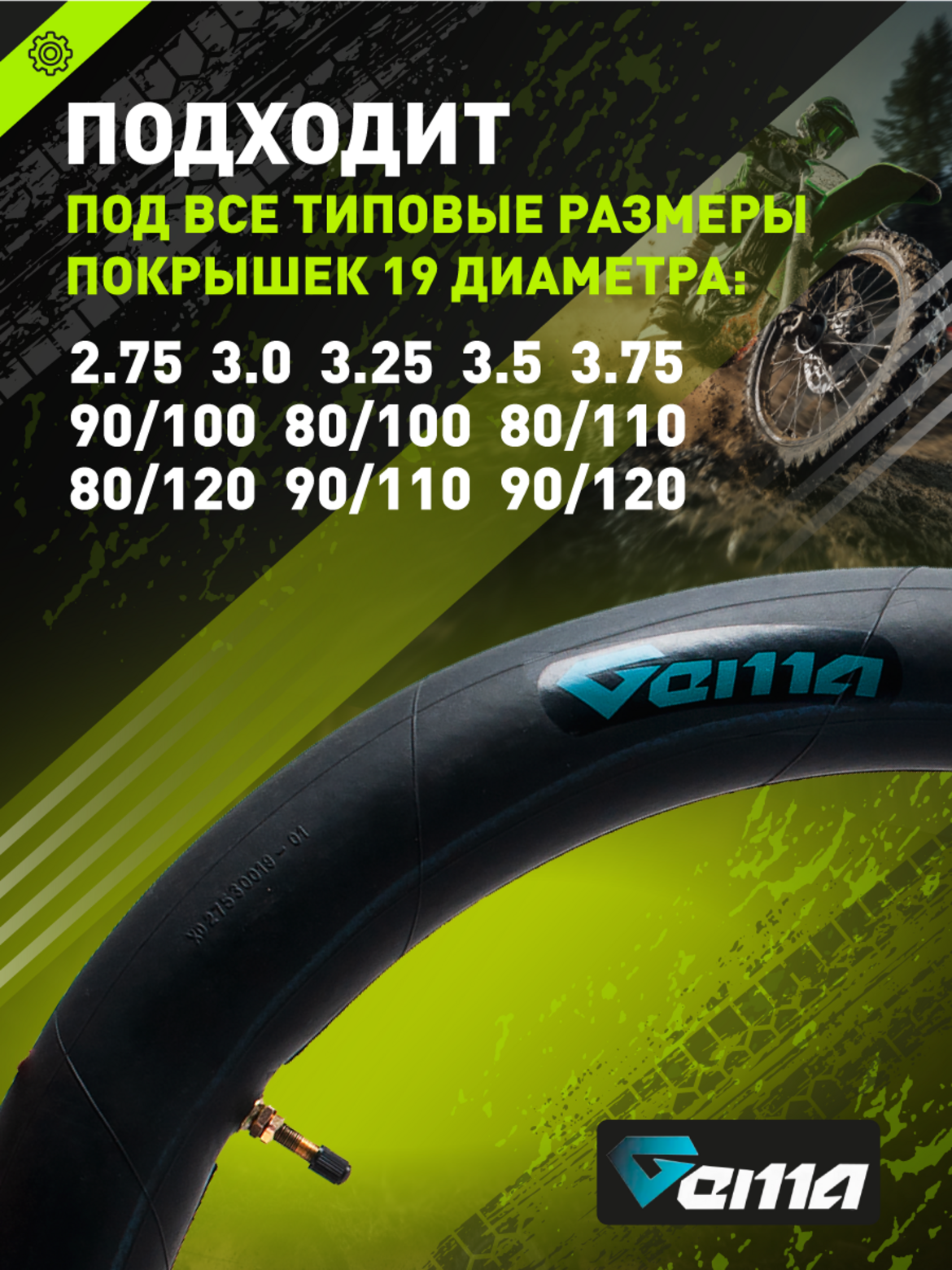 • Размер камеры: 100/100-19" (оптимально для шин шириной 3.00–3.25 дюйма)