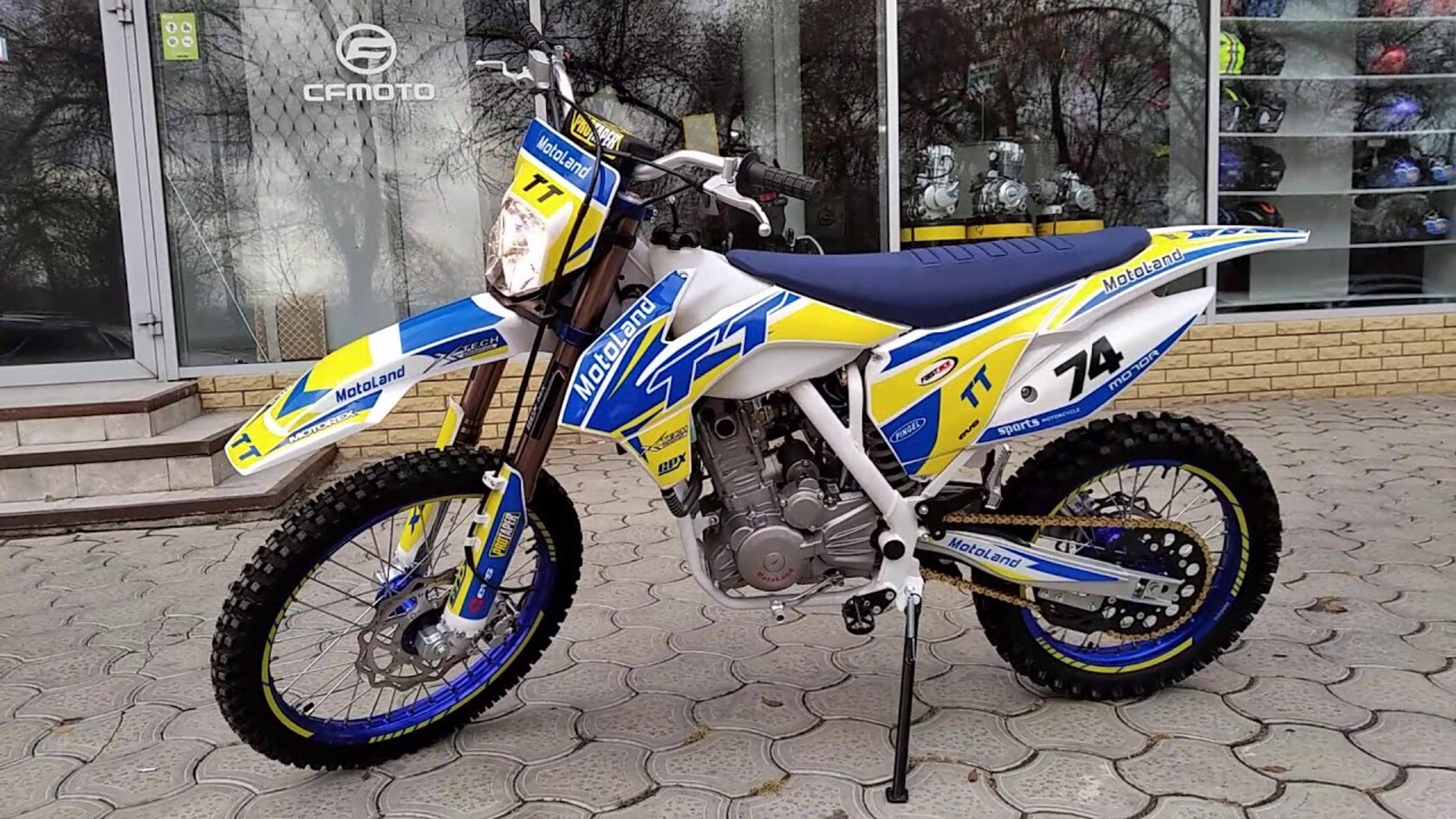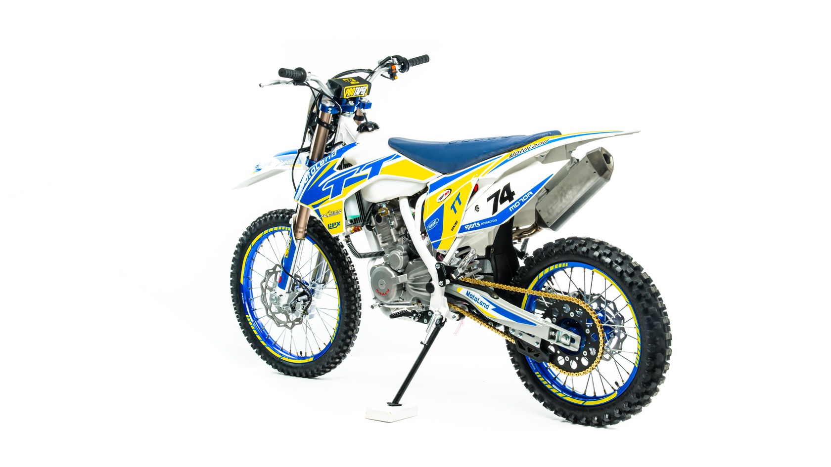 MotoLand TT 300 Новинка осени 2020 года.Надёжная техника из самых популярных компонентов оснащена Двигателем ZONGSHEN 174FMM с кикстартером и электростартером Мощностью 24 Л.С. на двигателе установлен Карбюратор NIBBI .Это полноразмерный кроссовый мотоцикл его база по осям составляет 1430 мм., и габаритами 2180х800х1300 мм. Высота по седлу составляет 950 мм., что по сравнению с Моделью XT 250 ST 21/19 ниже порядка 20 мм. Что позволяет комфортно себя чувствовать райдерам среднего роста.За счет сбалансированной базы мотоцикл имеет отличную управляемость, а конструкция рамы и особенности настройки подвески GPX способствуют максимальному поглощению неровностей дорожного покрытия, а так же усиленная прогрессия на игольчатых подшипниках.Алюминиевые обода c антибуксаторами, усиленными спицами и ступицами CNC. На кроссовой резине Yuanxing 80/100-21 / 100/90-18На мотоцикле установлена обновлённая тормозная система аналог «brembo» с медными колодками , что обеспечивает отличные тормозные характеристики. Особенностью заднего тормоза является, лапка верхнего расположения с эксцентриковой регулировкой.Выпускной патрубок с резонатором Power Bomb имеет крепления на пружинах для снижения вибрации. Глушитель с уникальным дизайном прямоточного типа, полностью алюминиевый для облегчения веса.